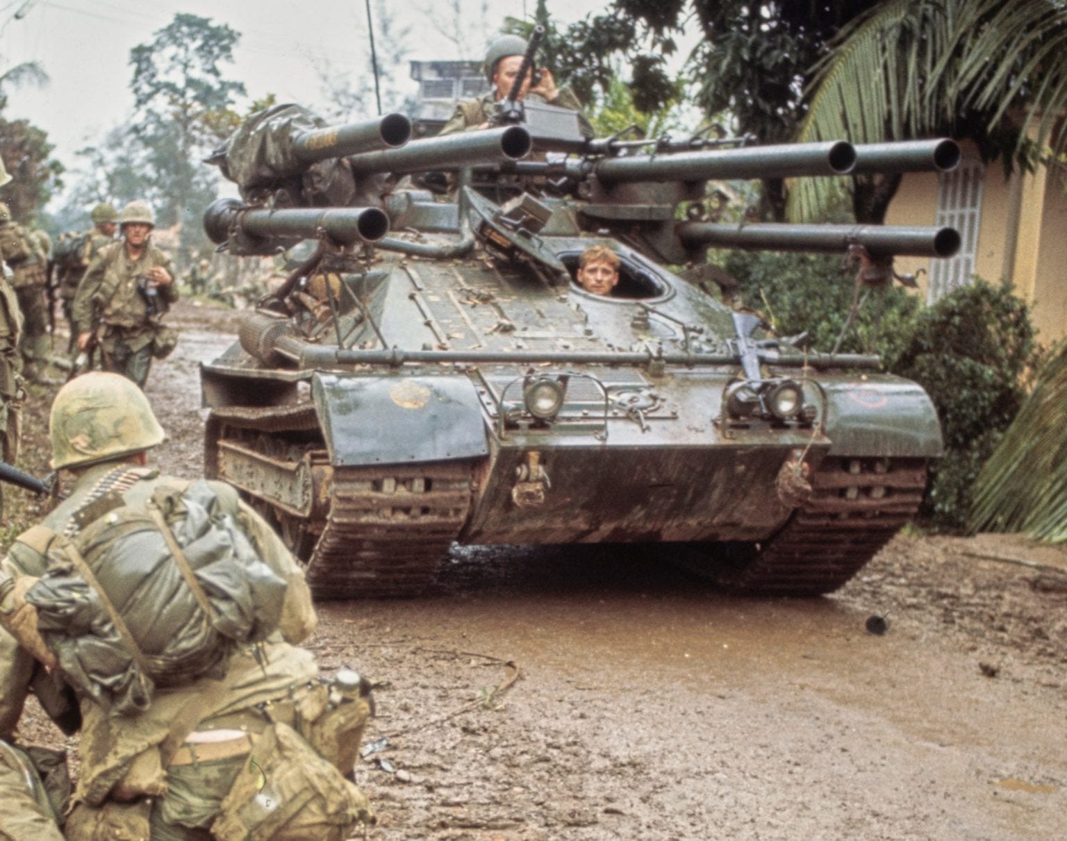 You see, it was designed to blow up tanks. And it did! During the Dominican Civil War in 1965, it was used to explode those…two tanks…the bad guys had. But it worked! However, when they sent the Ontos to Vietnam…well… It wasn’t like the North Vietnamese had a lot of tanks. Or really any at all. And I should point out that, at the time, there was no real battle doctrine as to how to use this monster. There wasn’t even a specific Military Occupational Specialty assigned to train guys up on it. So the U.S. Government basically just sort of sent these guys out there, where they figured out fairly quickly that these anti-tank guns work pretty well as anti-everything-the-heck-else guns too. Especially when you loaded the recoilless rifles with fléchette rounds, which basically turned each one into a gigantic shotgun full of hardened steel nails. Because heck you, Charlie and everything in your general direction that’s why. The enemy got to fear the Ontos so much that crews could clear entire buildings by firing a few spotting rounds at them. The bad guys knew to bug out because if they were still there after the tracer rounds hit, the building wasn’t going to be and their new pronouns were soon to be Over There and Over Here.