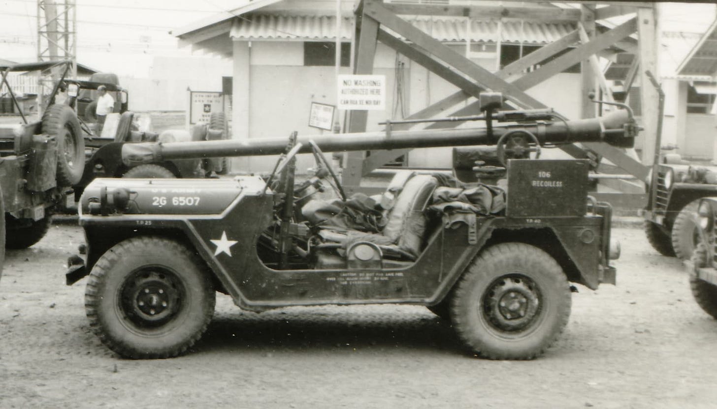 Now, I know what you’re thinking. How the heck do you even aim that thing, anyway? Glad you asked! You see, each recoilless rifle could be calibrated so that they all would hit at a certain point of aim. However, that would be pretty time consuming to get perfectly right every single time when you’re mass producing dozens and dozens of these things. Also, the M40 already had a solution for that. It’s got a smaller spotting semi automatic rifle mounted to the tube that fires a .50 caliber tracer round calibrated to match the trajectory of the 106mm round. Basically, you just start plinking away with the spotting rifle until you hit the thing you want to violently and spectacularly reduce into its component parts, then fire the 106mm recoilless rifle.